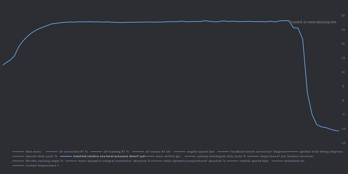 got a full pull in this morning. boost starts to creep towards redling, TD isnt keeping it down, might need to reflash again. http://datazap.me/u/terryjr/full-pull-27-28psi?log=0&data=2-4-6-7-12it starts to lean out a little at redline, was hitting 104% DC and found out a few miles down the road that the fuel smell i had wasnt the pcv, it was my RH fuel rail pissing gas all over my fender.