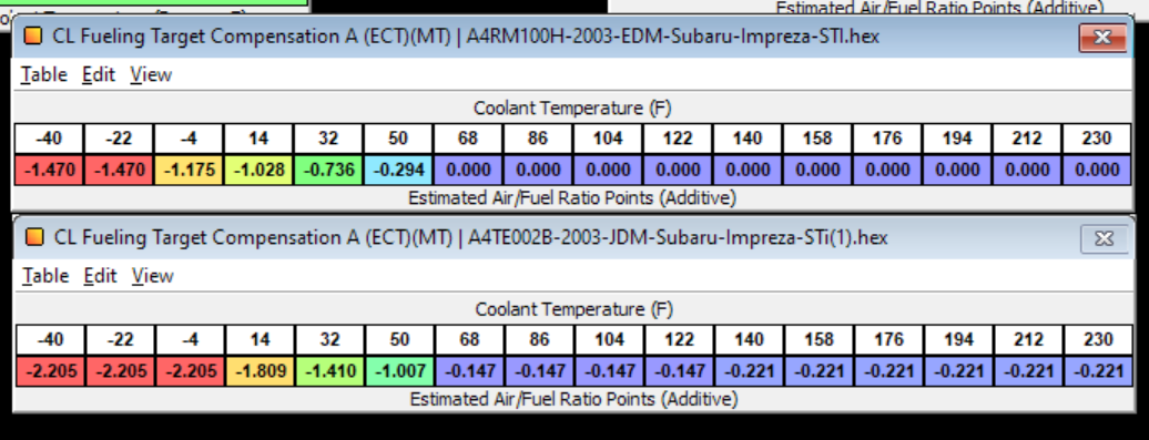 So It seems here we see that the EDM sti has zeroed out the compensation tables to have 14.7 instead of target, overall the EDM runs leaner with less compensation during warmup. Any special reason for this, does it ahve to do with fuel quality? I believe that Japan has better fuel quality to be fair.