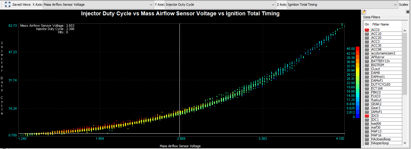 File comment: MAF volts by IDC, with TPS on z-axis you can see how the open loop TPS base min afr commands a higher IDC than lower throttle for the same MAF volts. I use this instead of a torque reduction from timing per gear or load based acceleration transient something or other