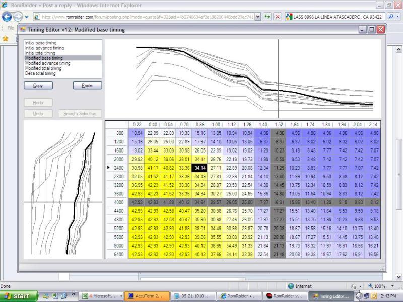 suebaroo wrote: Where do I fidn the Inital advance timing? That's "Initial" as in initial-vs-modified. Maybe I should call it before and after? You copy the base timing and advance timing tables from RomRaider and paste them into the initial base and initial advance tables in the editor. Then you party on the modified base and modified advance tables in the editor. You can toggle between the initial and modified tables to see how your changes compare to what you started with. When you're satisifed, paste the modified tables into RomRaider.
