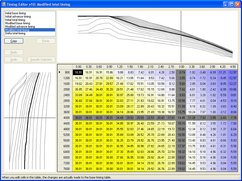 How to use: 1. Copy your base timing table from RomRaider to the timing editor. In the timing editor, select "Initial Base Timing." In RomRaider, open your "Base Timing" table, and use "Edit, Copy Table" copy the the values to the clipboard. In the timing editor, click Paste. Your base timing table should now be visible in the editor. 2. Copy your advance timing table from RomRaider to the timing editor. Same as above, but: Copy from RomRaider's "Knock Correction Advance Max" Paste into the editor's "Initial Advance Timing." (Some cars have multiple pairs of base and advance tables. Make sure you're using the base and advance tables from the same set.) 3. Move the mouse over the cells in the table, and watch how the table's shape is displayed. 4. Select the "Modified" base or advance tables, and notice the help text at the bottom of the window. 5. Make changes to the "modified" tables. Note that the "total timing" views can be inaccurate if your base and advance tables have different row and column headers.6. Copy the modified base/advance tables from the editor, and paste them into RomRaider. 7. Double-check everything in RomRaider.8. Flash, log, repeat. I cannot stress the double-check everything in RomRaider step enough. If you find a bug, please let me know. But if you blow up your car, that's your problem, not mine.  I flashed my car with tables created by this tool, so obviously I trust it that much. But you shouldn't trust me, you can only trust yourself. Version History: v1: Initial release. v2: Fixed bug regarding "Cannot find a part of the path c:\temp\paste.txt" v3: Made columns narrower to fit smaller screens better, fixed smoothing v4: Changed colors, added highlighting, fixed flickering, added error message for differing table sizes v5: Fixed bug that left the Smooth button enabled on the 'initial' (non editable) tables v6: Added undo/redo for single-cell changes v7: Added colors v8: Prettier colors, and fixed a crash that happened when not all tables were initialized v9: Keyboard shortcuts for undo/redo (only while the grid has keyboard focus) v10: Allows advance tables to have fewer columns than base tables (extra columns are added to left side of advance table) v11: Advance table is now padded on the left with the correct values v12: Pressing '+' or '-' will increment or decrement selected cells by 0.35