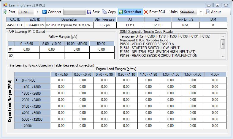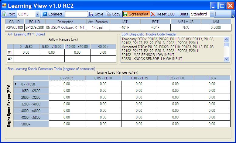 3. Adds reading and displaying of A/F Learning #3 (for applicable ECUs), Intake Temp, Coolant Temp, and Atmospheric Pressure. Unit drop-down box allows selection of standard or metric units for latter 3 parameters.