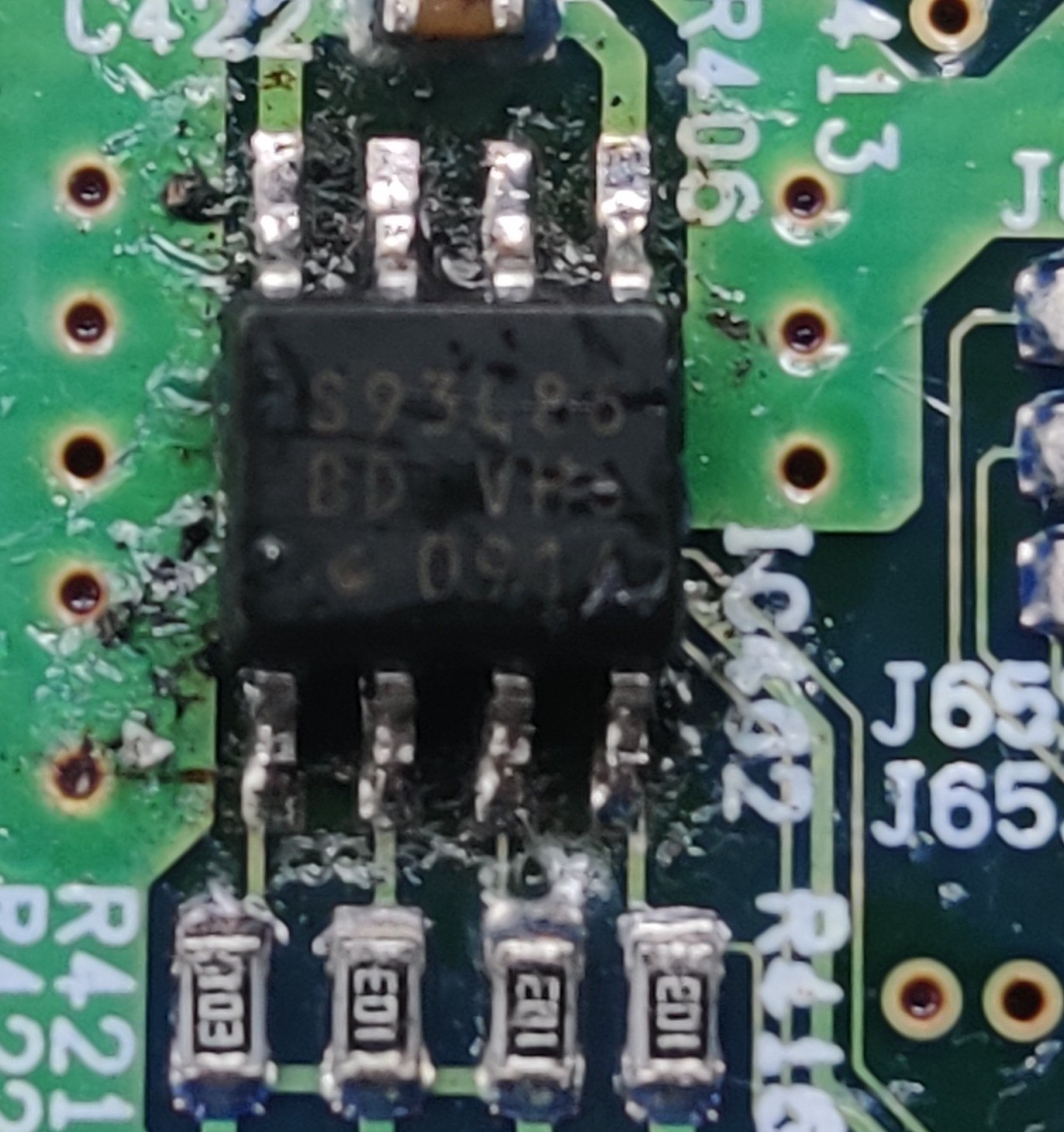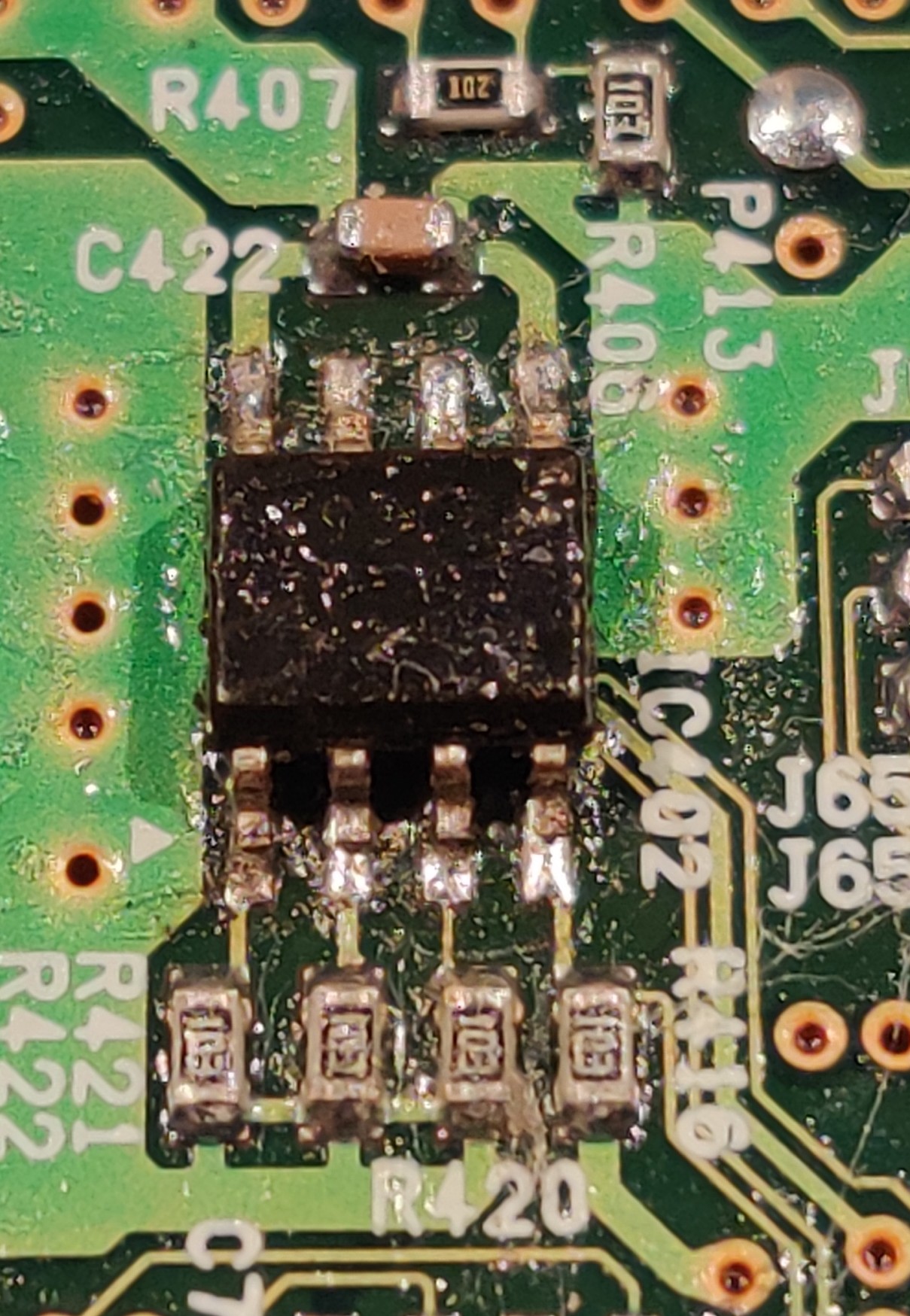Photo: I'm glad I took a photo of this before removing to try to read the chip number with the micro focus on phone camera. There is no pin 1 marking on it. The board coating also melts and obscures the letters.