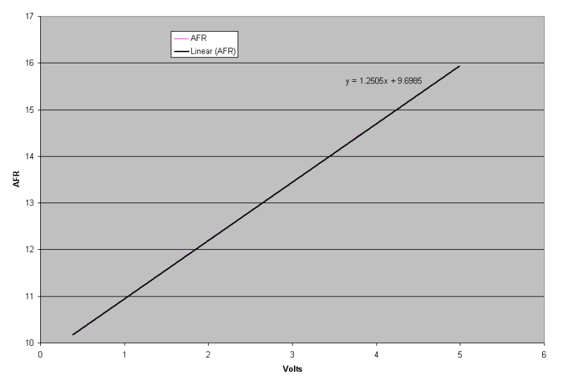 In Excel you can plot the AFR over volts. Then add a trendline and set the option to show the formula on the graph. Using the default settings in JAW Deploy I get: AFR = 2 X volts + 10 The results I got for your data is: AFR = 1.2505 X volts + 9.6985 as show in this graph Attachment: