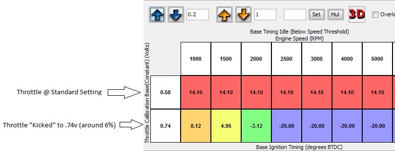 If you look at the idle timing tables and idle speed target tables you will notice they have two rows, one being .58v and one being .74v. These are slightly mislabeled as "Throttle Position Sensor (Volts)" (I have corrected the labels in the upcoming version). The parameter that these tables are actually referencing is basically the amount of "throttle kick" that has been applied, the .58v row is stock throttle position(completely closed) and the .74v row is about a 6% throttle kick(this row will be used at higher kick percentages as well). This referenced value remains constant no matter what your current TPS voltage is. So now these tables start to make a little more sense, you can see that the ECU removes timing and adjusts the idle speed target based on the amount of throttle kick that has been set in order to keep the engine from revving up due to the cracked open throttle. I have done some testing and I can tell you that with the throttle kicked open a bit the engine definitely has a more "lumpy" idle that is usually associated with rally cars. Having the throttle kicked should produce a much more aggressive ALS, I haven't done any testing yet but I will soon.