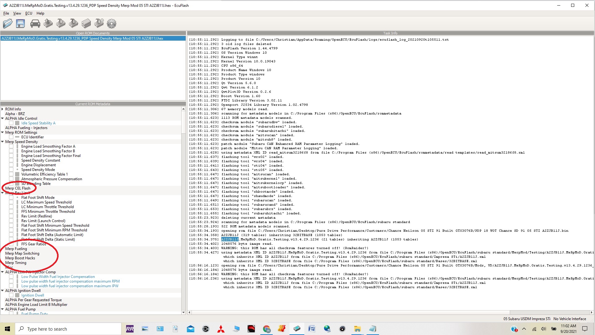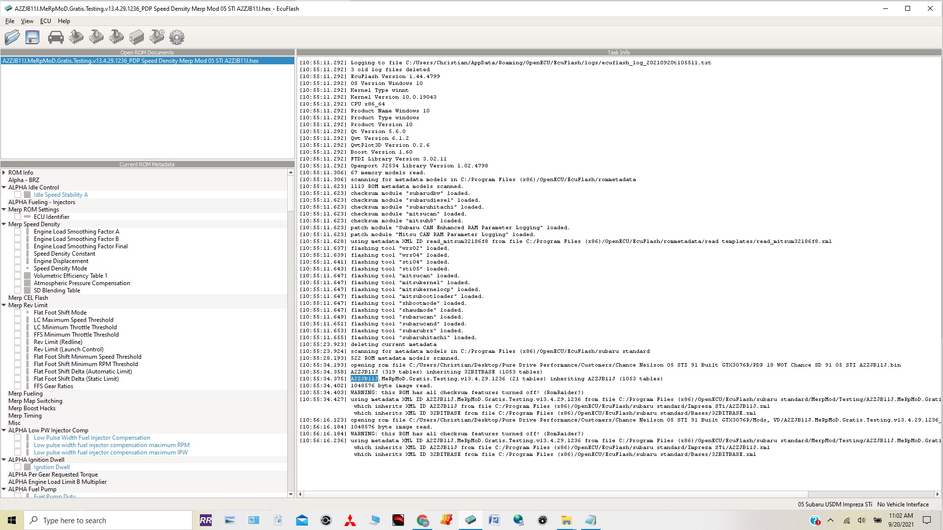 Hi all, I have a 2013 STI that I am trying to tune with MerpMod, and would really appreciate some help. I grabbed a copy of a flex fuel capable version from here - viewtopic.php?f=37&t=14020, but I don't think the definitions are working properly/or at least not in the way that I would expect them to work for flex fuel. It looks like an older version, but I've tried building MerpMod myself and I'm close, but still getting errors in compiling etc. Q1 - There is a map blending for injector, throttle, cranking, startup. As far as I can tell, I use a multiplier in these maps to add more fuel (after setting up the input via the sensor). So if I understand - as an example, if I have a 1012cc base injector, and I want to make the ECU add 38.6% more fuel by volume then I put 0.755 in this map, making the ECU calculate its injector times like it is 764cc and therefore add more fuel. Is that a correct understanding? Q2 - There appears to be no map blending for boost or timing? Normally I would add more boost and more timing on the E85 side. Or is that only possible via the SI drive maps? I've attached the ROM I am using, with the definitions, and a screenshot of what I can see in the Eculash menu.
