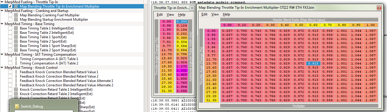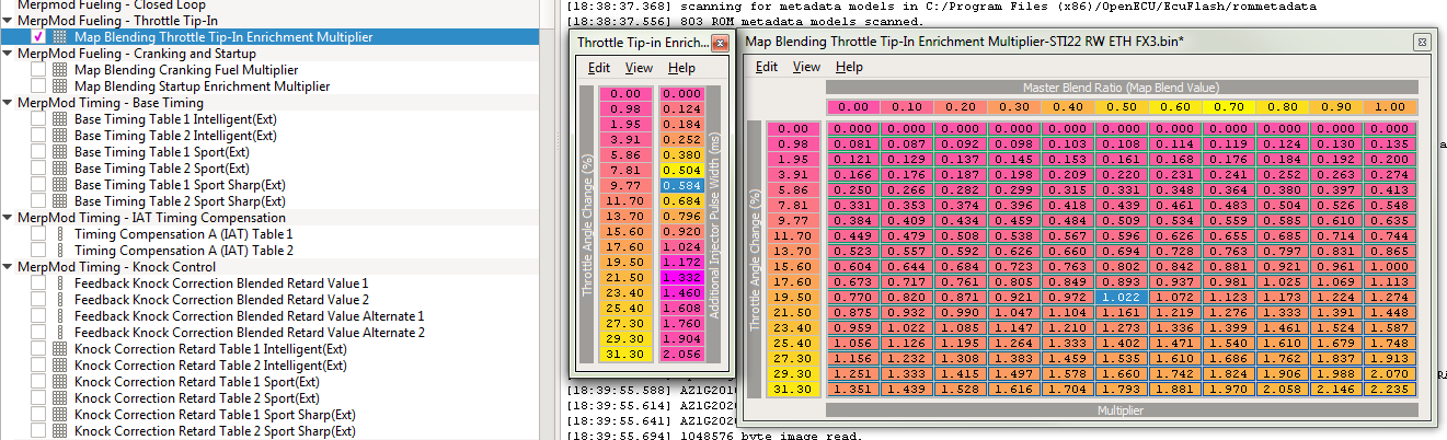 Thanks RomRaiders! This is the table I'm talking about. This can't possibly be right for E85, can it?  Sorry!! I swear I replied to your initial post, I know I typed out a reply but must not have hit submit. Yes, that's the table that you want to alter fueling for E85 (injector scaling obviously, you'd use Open Loop Fueling I/S/S# Map 2 for actual fueling). Where are those numbers from? Change them to how you need. ie, E85 needs around 30% more fuel as a baseline, so set it accordingly. I think when I ran E85 I ended up around 1.4 to keep fuel trims the same, and then horizontally interpolated back to 1.00. From memory, the AZ1G101M file was set to defaults (ie, 1.0 across the board), if you wanted to see what the defaults should be. I am also setting up flex fuel on merp in my 04 STi and did the same calculation (1.42 interpolated back for the scaler multiplier) I noticed there is a blending ratio value, I wanted to confirm that setting this ratio to .50 would interpolate between Map 1 and 2. and I presume settings like .25 would interpolate towards Map 1 and .75 more towards Map 2? See pic below.