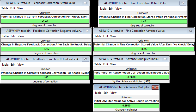 Aaah - OK, that makes sense. Your comment about base and ECU-specific code forced me to look closer into definition file, and now I see there are two "sections" - AE5W101V, and "32BITBASE" so I suppose that is what you are referring to. It seems like AE5W101V section only lists the names of the tables, and addresses in the ROM where to find the values, and 32BITBASE acts as the "formatting" tool for those tables where names match... I know I am probably oversimplifying it - please correct me if that is wildly off-base. I have read through the preemptive knock thread you referenced, and it is quite interesting. It got me thinking, so I tried and added an address for this "preemptive" value I found in that thread for AE5W100V ROM (which I modelled mine on anyway) - DCE80. I added this code in AE5W101V section of my def file: Code: <table name="Feedback Correction Retard Value ALTERNATE" storageaddress="DCE80" /> And "formatted" the table by copying one of the existing ones and renaming it in "32BITBASE" section: Code: <table type="2D" name="Feedback Correction Retard Value ALTERNATE" category="Ignition Timing - Knock Control" storagetype="float" endian="little" sizey="1" userlevel="4"> <scaling units="degrees of correction" expression="-x" to_byte="-x" format="0.00" fineincrement=".1" coarseincrement=".5" /> <table type="Static Y Axis" name="" sizey="1"> <data>Potential Change in Current Feedback Correction Per Knock 'Event'</data> </table> <description>Preemptive step value for each negative adjustment to current feedback correction.</description> I then put my ROM image I have saved on the computer into RR using this newly modified def file, and I got the value from that address in the newly added table. But the value is again -1.4 degrees. So no matter what I do, I can't find -1.5 degree value defined anywhere ... But I think this "preemptive" concept is definitely what I am seeing in my logs. I am just curious as to why I can't find the "source" of it anywhere in defined tables. I am not yet confident enough in my RR understanding to be making actual changes to the ROM, and flashing them. So this is part of my learning process. It is not that I am not confident about LTV, but when I see inconsistencies I want to learn as much as possible about their causes